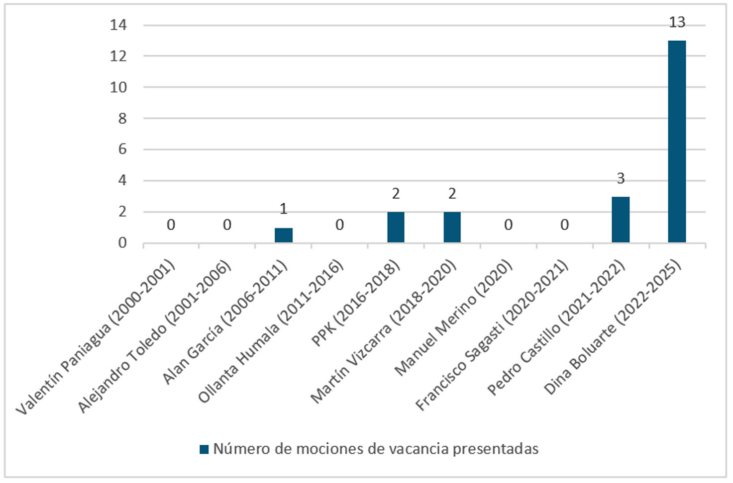 Dentro de esta crisis continua, ha aparecido un instrumento constitucional relevante que llevó a una escalada en el conflicto entre los poderes Ejecutivo y Legislativo: la vacancia presidencial por permanente incapacidad moral, figura polémica cuyo uso no encuentra una interpretación consensuada entre juristas. Como muestra de la creciente relevancia de la vacancia por permanente incapacidad moral, se puede observar la cantidad de veces en las que este mecanismo ha sido activado desde 2016 en adelante, pudiéndose contabilizar hasta 16 mociones de vacancia presidencial presentadas en contra del presidente de turno. No obstante, un hecho interesante es que, si bien no ha existido un cambio sustancial en la normativa vigente, lo que sí ha existido es un cambio de la dinámica política (Dargent y Rousseau, 2022), producto del cambio en la correlación de fuerzas desde 2016.