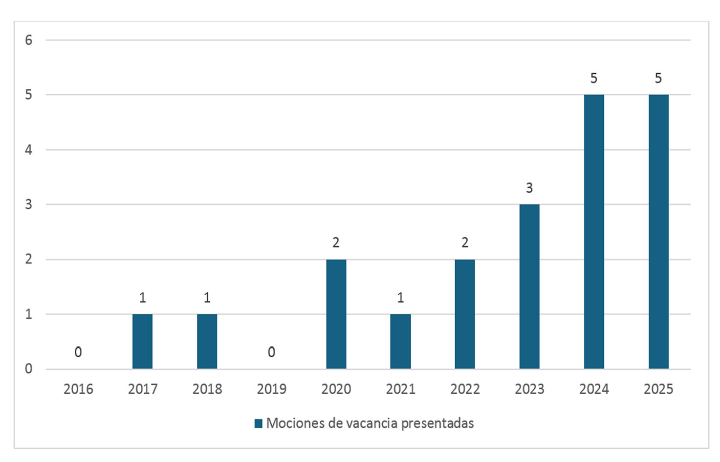 Para concluir, es necesario mencionar que este artículo ha analizado las mociones de vacancia presentadas en el periodo entre 2016 y 2024 en un primer momento, y ha sido actualizado el 19 de octubre de 2025, tras la vacancia de Dina Boluarte. Posiblemente se presentarán más pedidos de esta naturaleza en los próximos años, por lo cual es necesario mantener esta línea de investigación actualizada con frecuencia, con el fin de monitorear si esta tendencia continua o se quiebra en el futuro.