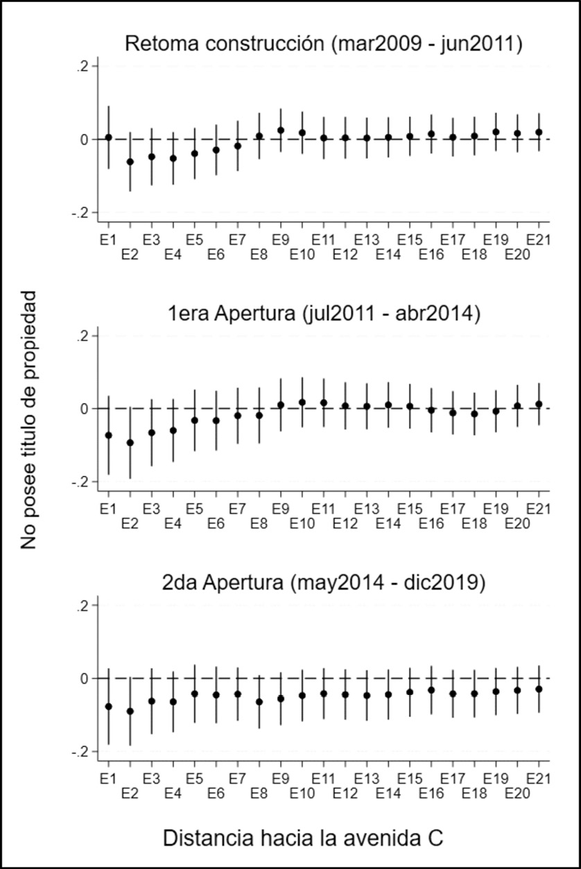 En segundo lugar, al igual que las viviendas mejoran, es posible que las empresas locales también estén mejorando. Las empresas se enfrentan a un nuevo panorama caracterizado por una mayor demanda de usuarios de los transportes masivos, lo cual genera una mayor cantidad de ventas. Esto ocurre porque las empresas cercanas a los sistemas de transporte masivos logran invertir en sí mismas y aumentar su productividad (Cohen y Paul, 2007; Dorantes et al., 2011; Pastor et al., 2019). Sin embargo, no todas las empresas tienen la capacidad suficiente para corresponder a la nueva demanda, principalmente porque no pueden competir con las nuevas empresas que han sido atraídas. Así como es posible que existan indicios de desplazamiento de personas, es posible que también exista un desplazamiento de empresas locales por empresas de mayor envergadura. El primer mecanismo estudiado empíricamente en esta investigación sugiere un mejoramiento de las viviendas, pero no se explora qué ocurre luego con las viviendas. Es posible que el mejoramiento de las viviendas ocurre para que luego sean vendidas a un precio mayor a las empresas que desean ingresar al nuevo mercado.