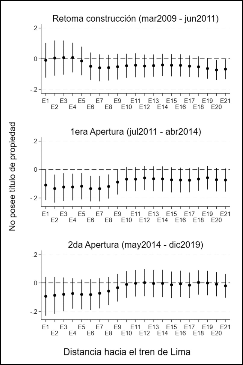 En esta investigación también se han explorado dos mecanismos de por qué el tren de Lima impactaría en la informalidad de la vivienda: i) mejoramiento de las viviendas y ii) migración de personas. Se ha evidenciado que, en el periodo de apertura del primer tramo del tren, se reduce la informalidad de vivienda y, paralelamente, existe un mejoramiento de las paredes y techos de las viviendas. En menor medida, se evidencia un aumento en el precio de alquiler de las viviendas cuando se apertura el primer tramo del tren. Estos indicadores pueden sugerir que los residentes son conscientes de que hay un aumento en el valor de sus viviendas y están realizando arreglos para aumentar aún más el valor de sus viviendas. Adicionalmente, se explora la migración como otro mecanismo que puede influenciar en la formalización de la vivienda. En este caso, se ha evidenciado que no existe un patrón claro que identifique más personas migrantes a menos de 1 km del tren en comparación con las personas que viven entre 1 km y 5 km.