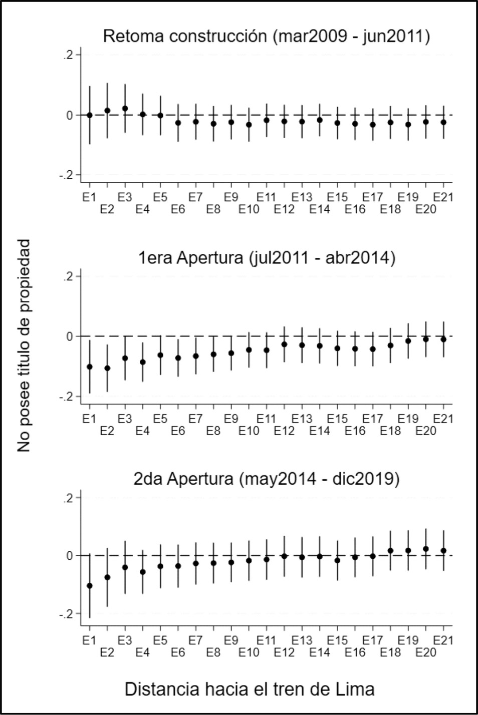 Donde i es la vivienda y a es la fase en que se encuentra el tren. Grupoi corresponde a una variable dicotómica que toma el valor de 1 para las viviendas a menos de 1 km y 0 para las viviendas entre 1 km y 5 km. Periodoia es un conjunto de cuatro variables dicotómicas que hace referencia a las fases del tren. Periodoi1 toma el valor de 1 cuando la encuesta fue realizada en febrero del 2009 o antes y 0 en caso contrario. Periodoi2 toma el valor de 1 cuando la encuesta fue realizada entre marzo del 2009 y junio del 2011 y toma el valor de 0 en caso contrario. Periodoi3 toma el valor de 1 cuando la fecha de la encuesta fue entre julio del 2011 y abril del 2014 y toma el valor de 0 en caso contrario. Periodoi4 toma el valor de 1 cuando la fecha de la encuesta fue a partir de mayo del 2014 y 0 en caso contrario. Se usa como referencia al Periodoi1, lo cual representa la fase antes de que se retome la construcción del tren. Adicionalmente, se añaden efectos fijos por año (δt) y por distrito (δd). Dado que algunas áreas pueden urbanizarse más rápido que otras, se decide añadir una tendencia (τg) cada 4 km como se muestra en el panel B del Gráfico 1. Los errores estándar se agrupan por conglomerados porque las coordenadas geográficas se asignan a ese nivel.