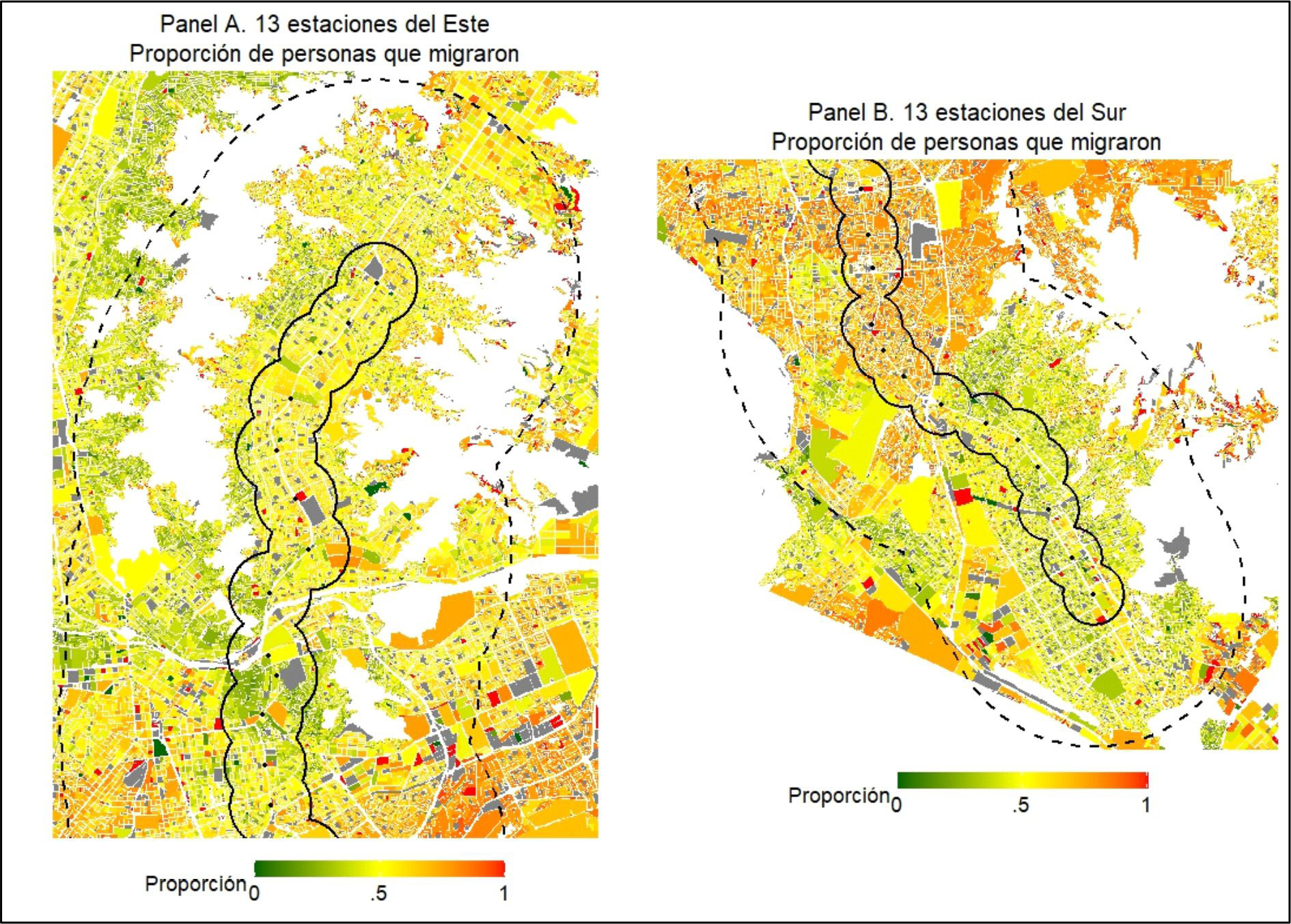 En segundo lugar, el aumento en el valor de las viviendas también puede ocurrir por un proceso de migración. En el Gráfico 5 se muestra la proporción de personas que migraron entendidos como aquellos que no viven en los distritos donde nacieron. Se observa que no existe un patrón claro que indique que, a menos de 1 km del tren, existe mayor cantidad de migrantes que en las áreas entre 1 km y 5 km. Sin embargo, se observan conglomerados de personas que migraron en el centro de la ciudad. En particular, resalta una mayor cantidad de personas migrantes en la parte superior del Panel B, lo cual corresponde a las estaciones Jorge Chávez, Ayacucho, Cabitos, Angamos y La Cultura. Estas estaciones se encuentran en distritos con mayores niveles de ingresos y no necesariamente las áreas a menos de 1 km del tren tienen más personas migrantes que las áreas entre 1 km y 5 km.